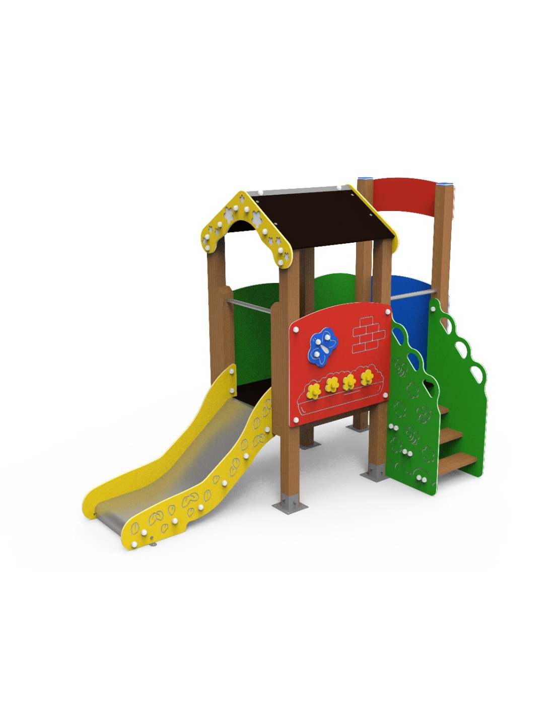 Consta de una torre con casita y un tobogán de 60 cm del suelo. Dispone de unas escalera de tres peldaños con pasamanos. La estructura está realizada con postes de madera tratada en autoclave nível IV y paneles de piletileno de alta densidad con protección UV, la rampa del tobogán es de acero inoxidable y los componentes metálicos están debidamente galvanizados.