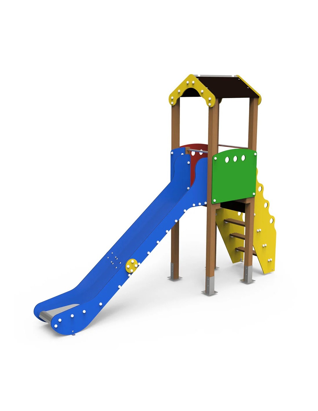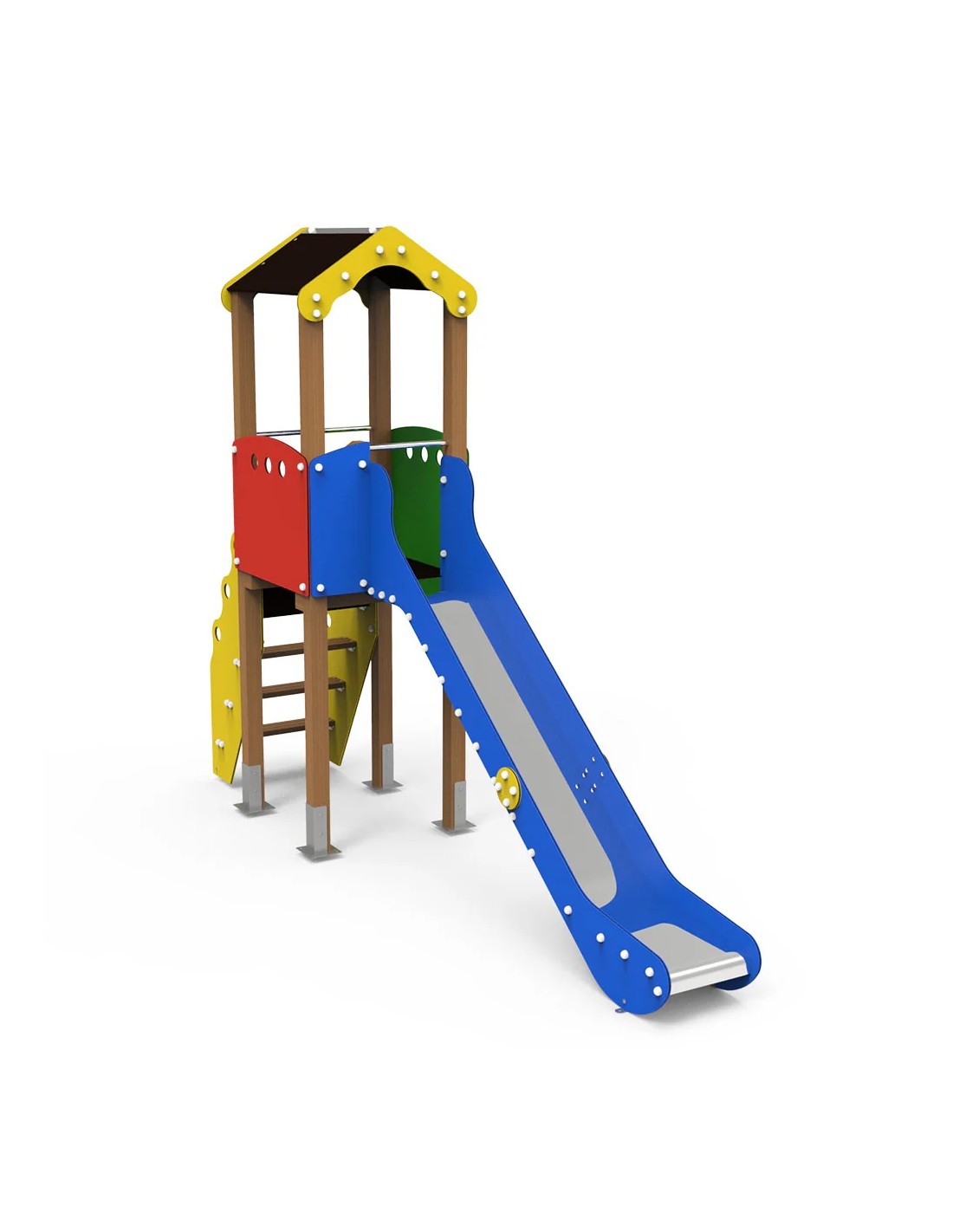 Estructura realizada en madera tratada en autoclave nivel IV, escalerilla de madeira tratada y barras de inox, laterales del tobogán y protecciones superiores en polietileno, rampa inoxidable, altura caída 1,36m.