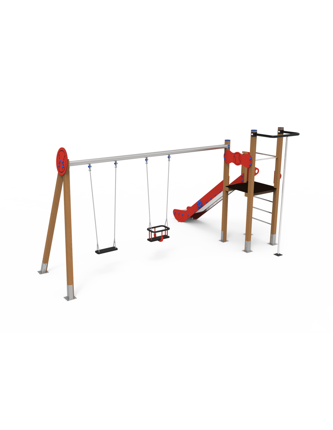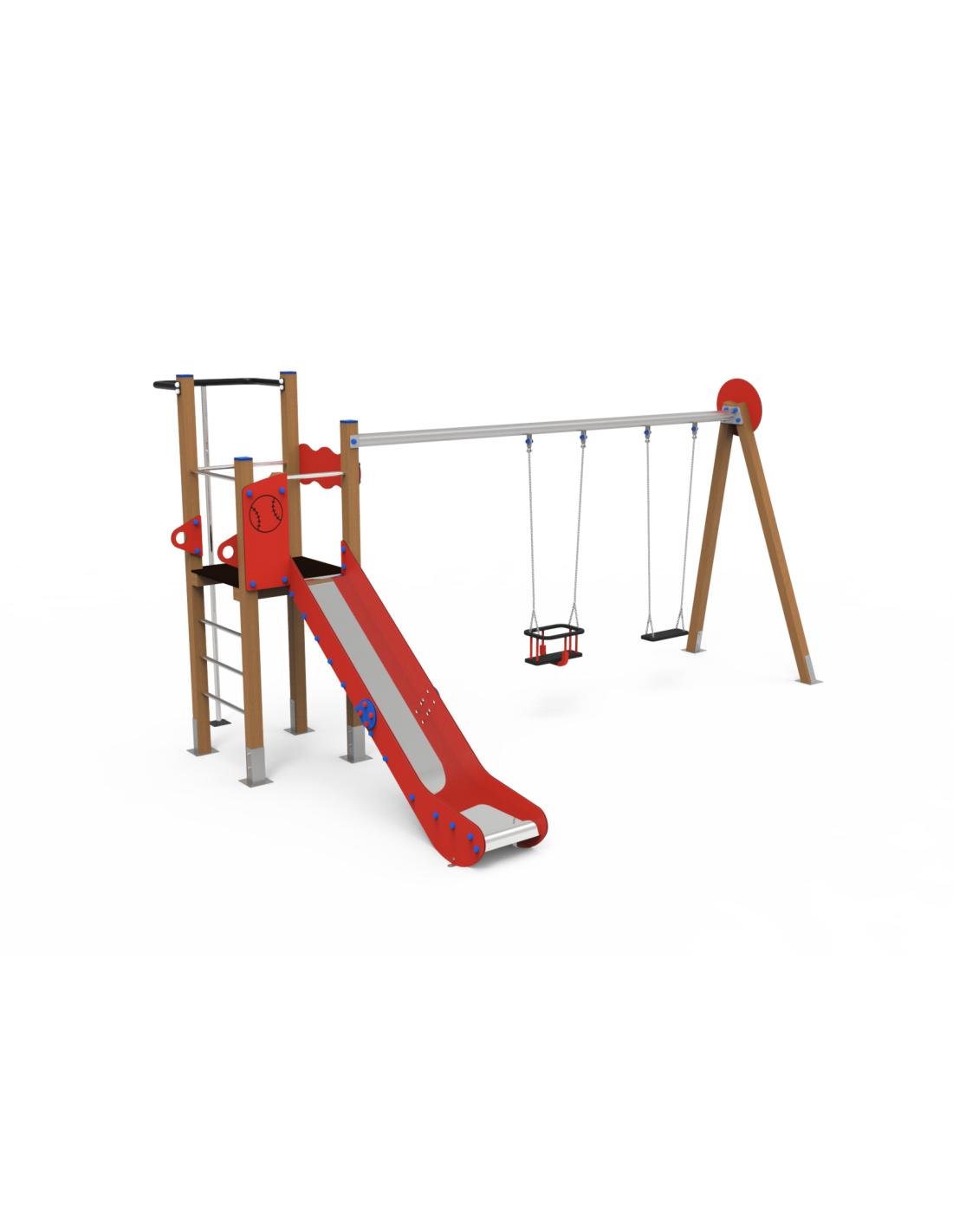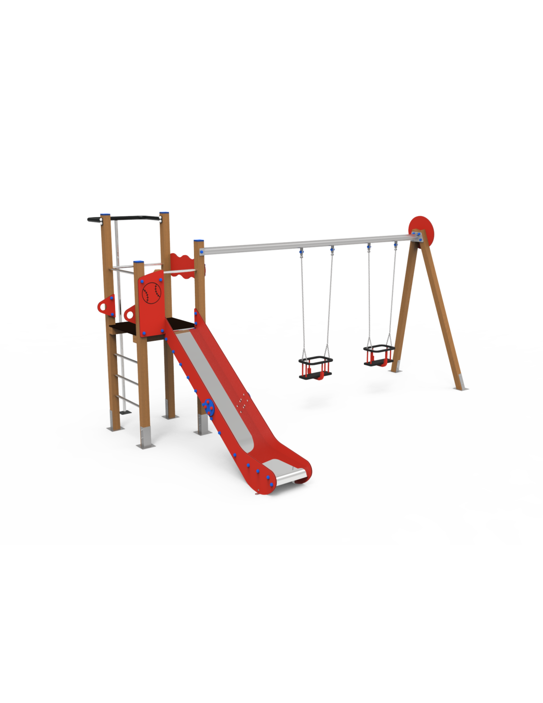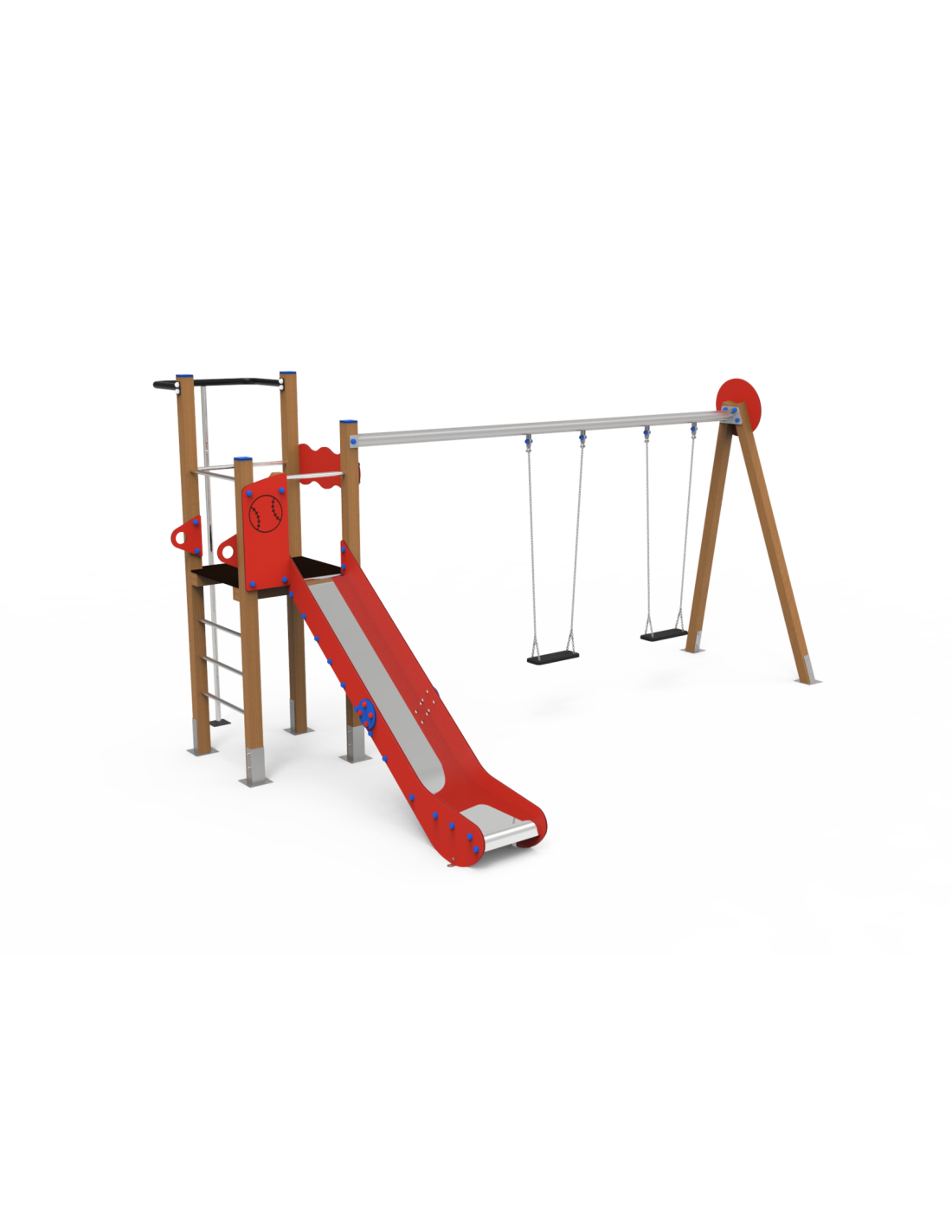 El parque infantil homologado para uso público "Torre BÉISBOL con columpio doble" de la serie Sport está formado por una torre elevada con tobogán, un columpio con 2 asientos y en la parte trasera una barra de bomberos para deslizarse.